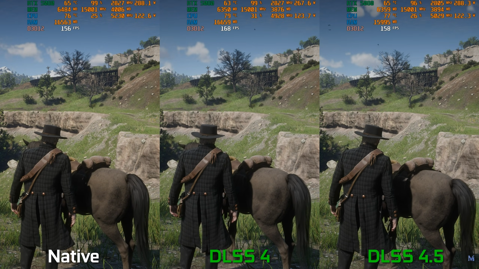 Com a nova versão do aplicativo da NVIDIA e drivers atualizados, o DLSS 4.5 Super Resolution já pode ser utilizado em qualquer jogo compatível com DLSS e, em alguns casos, a qualidade de imagem chega a superar a renderização nativa. Um vídeo do canal MxBenchmarkPC comparando Red Dead Redemption 2 nas versões DLSS 4 e DLSS 4.5, em 1440p e 4K, mostra ganhos visuais claros no modo Quality, especialmente em terrenos e vegetação, que aparecem mais nítidos na RTX 5080 usada no teste.